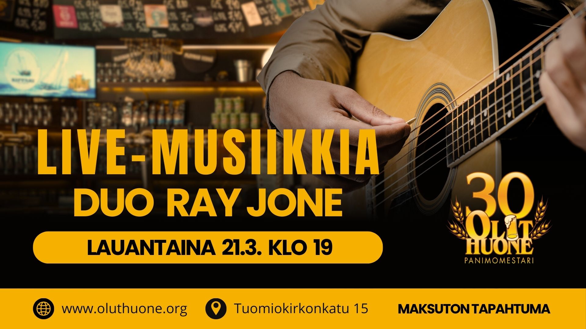 Oluthuoneella livemusiikkia laidasta laitaan 21.3. klo 19 alkaen Duo Ray Jonen säeistämämä. Tervetuloa! Maksuton tapahtuma.