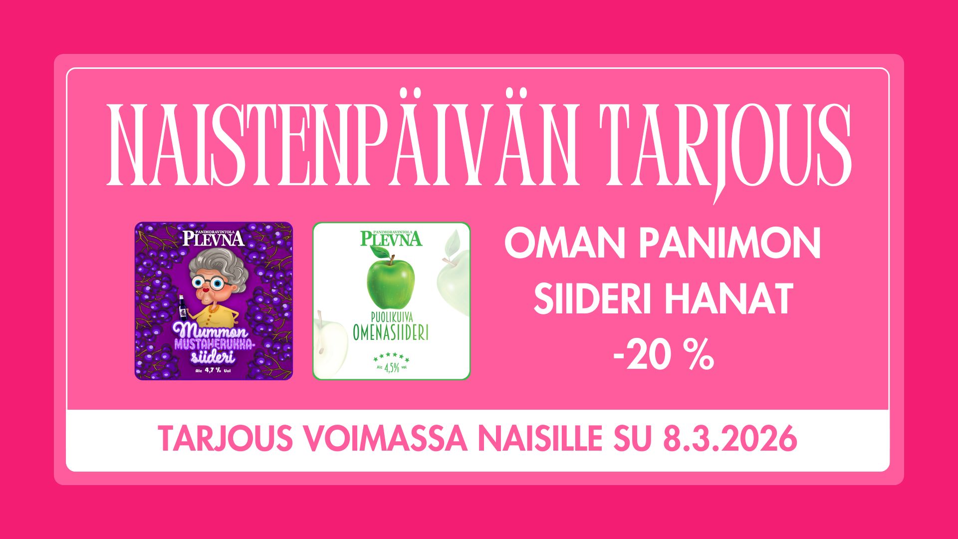 Naistenpäivänä Oluthuoneella oman panimon siideri hanatuotteet -20 %! Tarjous voimassa naisille 8.3.2026
