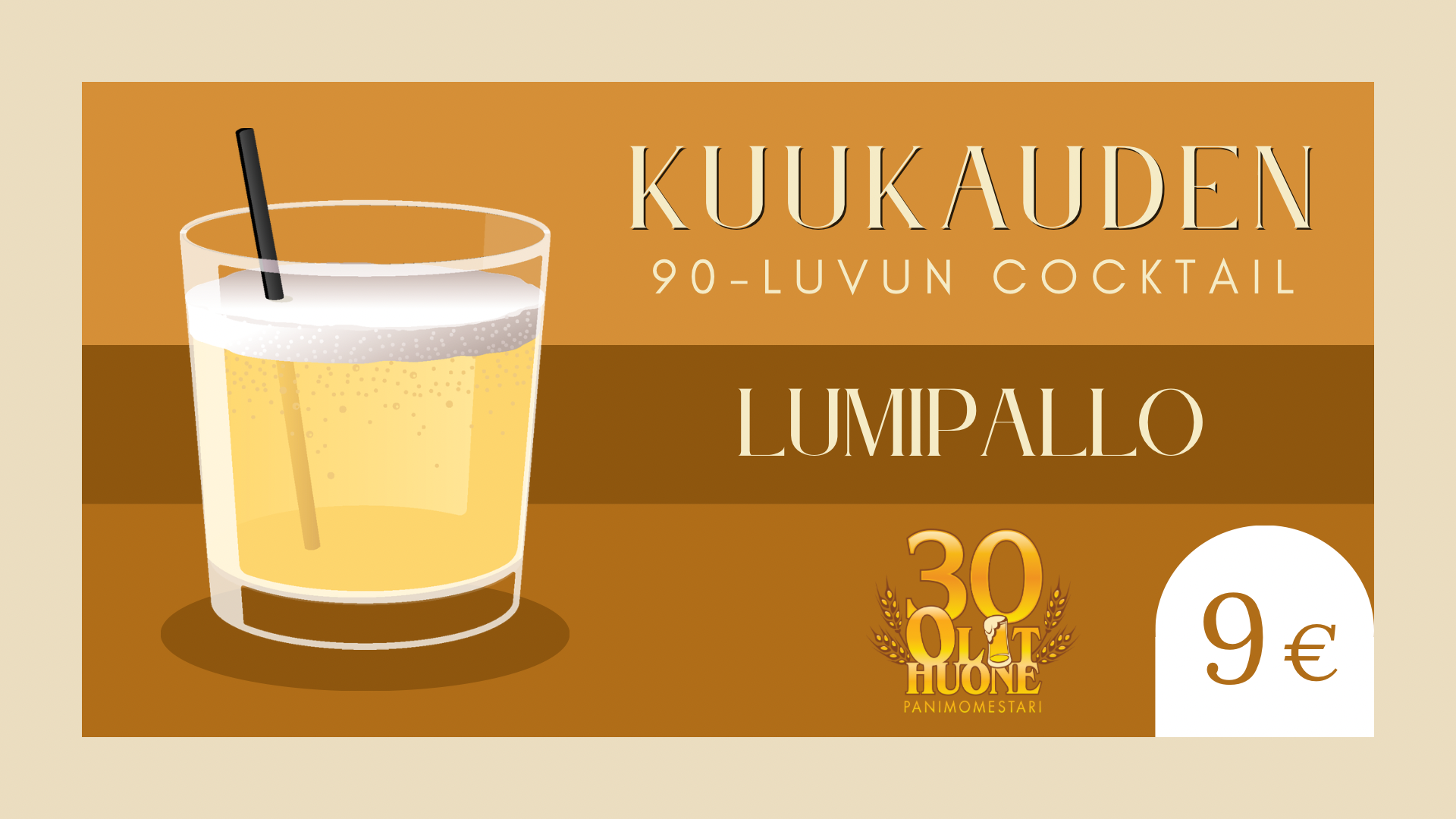 Oluthuone juhlistaa 30-vuotisjuhlavuottaan tarjoamalla asiakkailleen kuukausittain klassikkococktaileja perustusvuosikymmeneltään! Maaliskuun 90-luvun Cocktail:Lumipallo 9,00 €