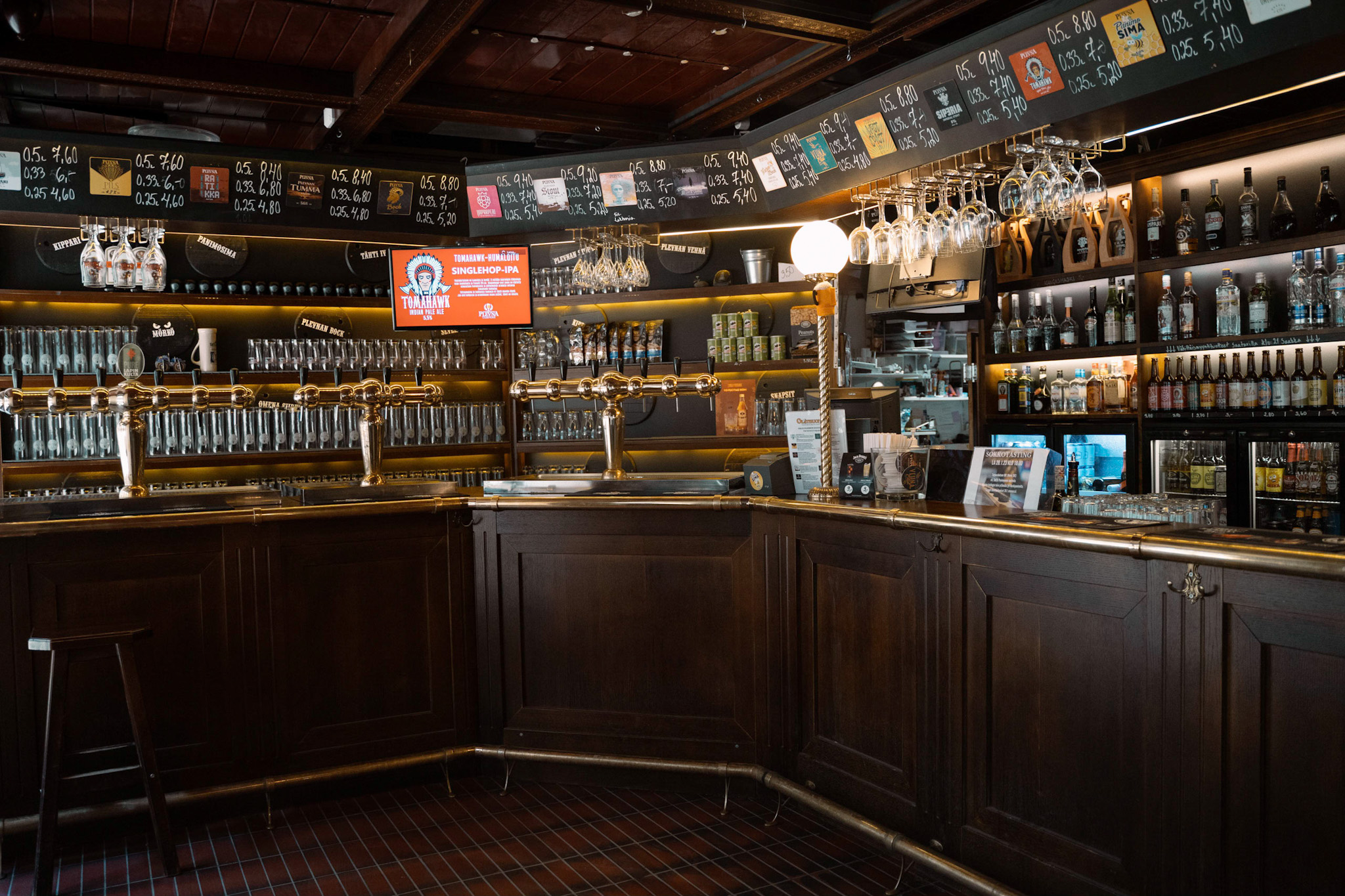 A particularly wide selection of Koskipanimo’s products, such as Plevna’s Light Pils, Bock, Wheat beer, Siperia, Apple Cider, and many other changing seasonal products. Kippari in tab only at Oluthuone. A-rights.