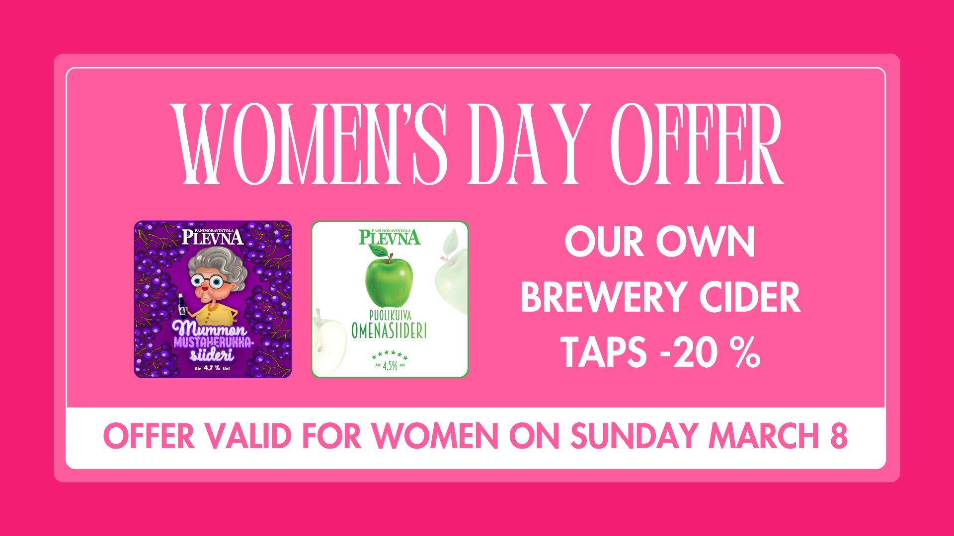 On Women’s Day at Oluthuone, our own brewery’s cider tap products are -20%! OFFER VALID FOR WOMEN